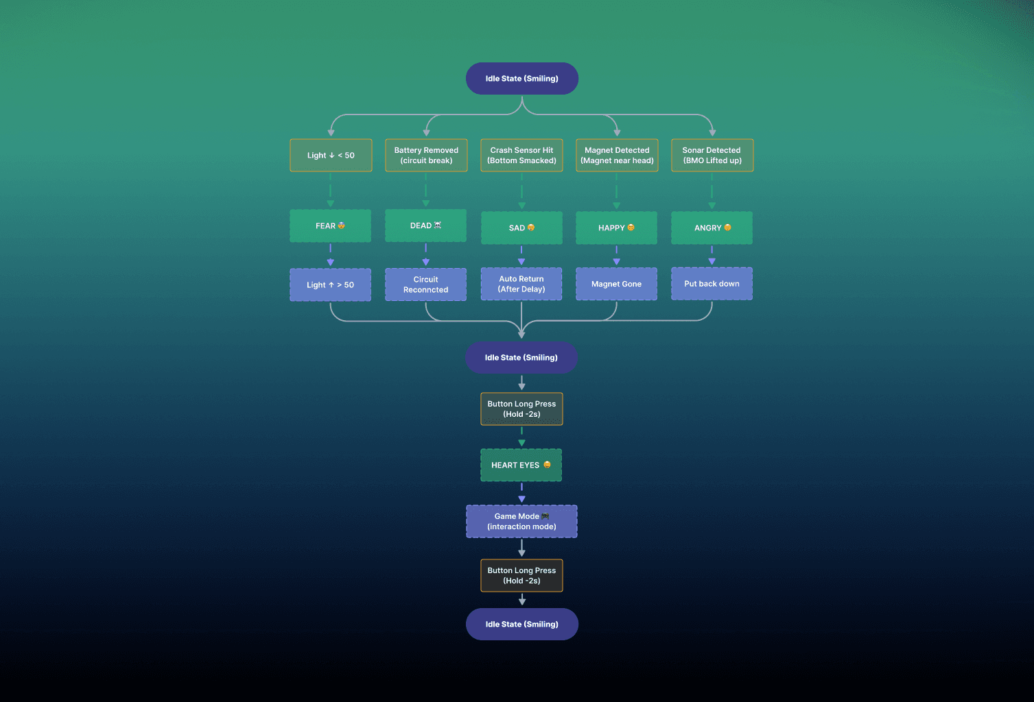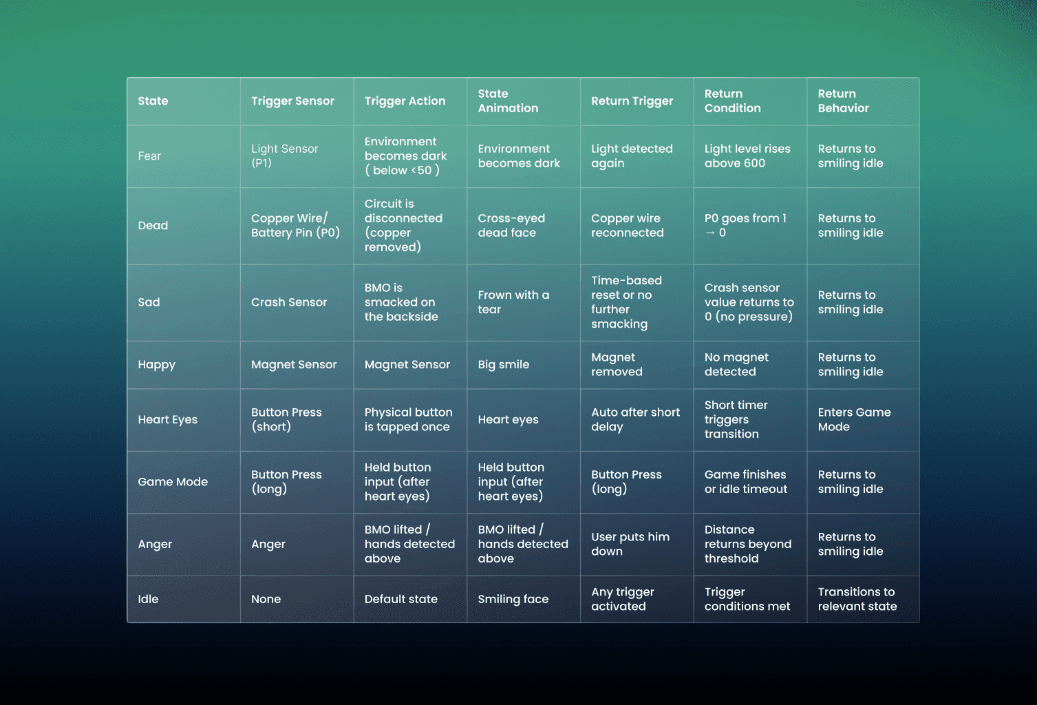 Fear – Triggered when ambient light drops below a threshold. BMO looks scared, as if he’s afraid of the dark.